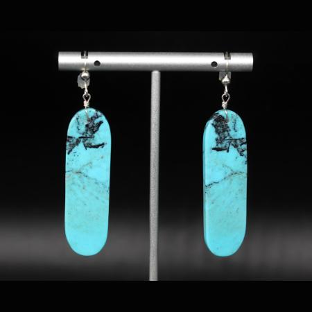 These traditional turquoise slab earrings are made from hand cut and polished Nacozari turquoise. They are handmade by Jennifer Medina of the Kewa tribe, also known by the Spanish name of Santo Domingo Pueblo, in northern New Mexico, USA. These turquoise slab earrings measure 6.5cm in overall length, including the sterling silver ear wire. The turquoise slabs measures 48mm x 14mm.